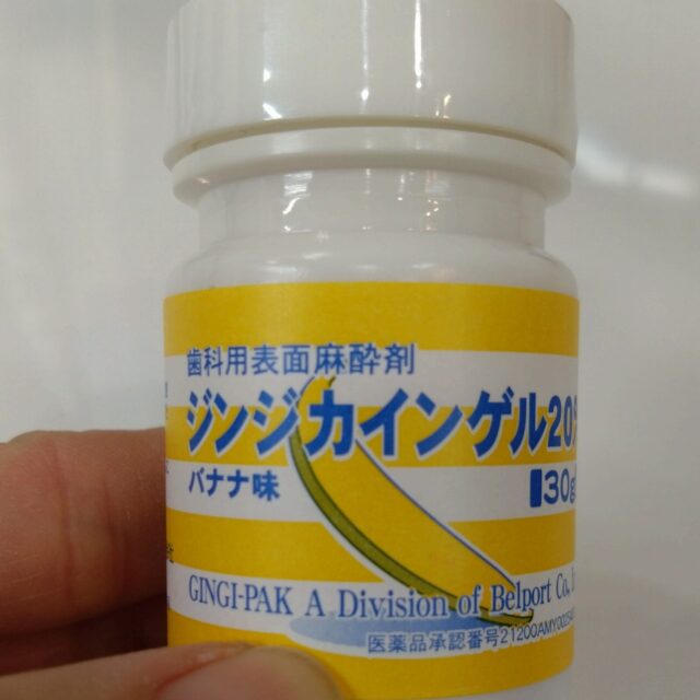 当院で使用している表面麻酔と歯科電動麻酔器です。表面麻酔はバナナ味ですが苦手な方はおっしゃってくださいね。